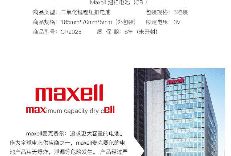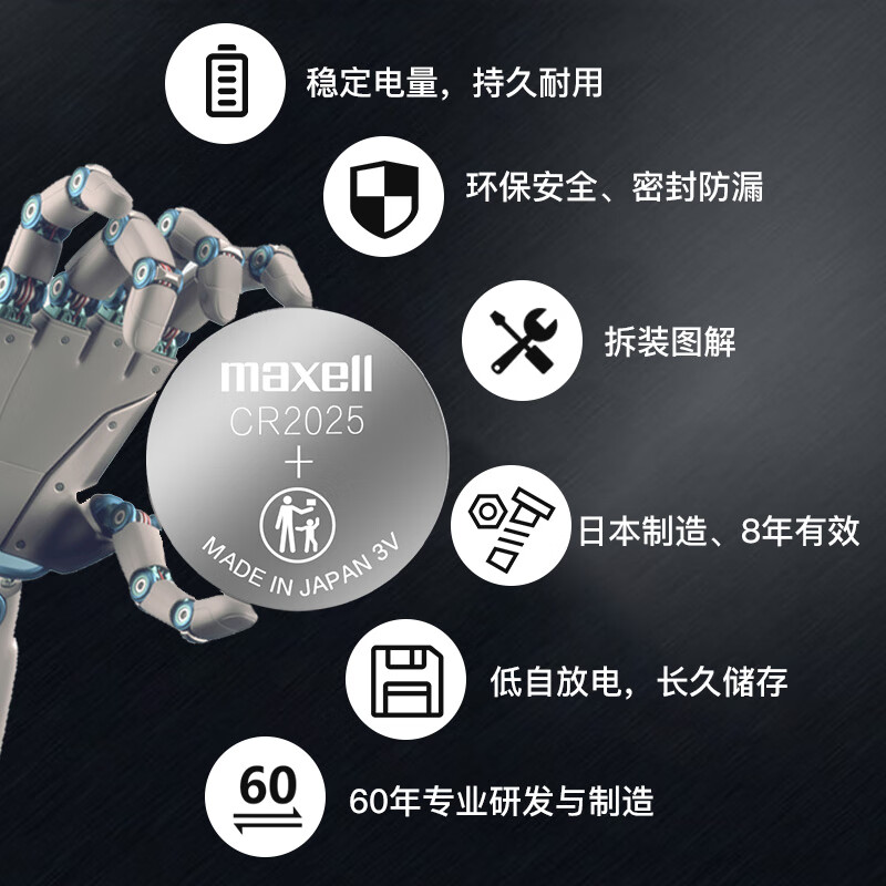 麦克赛尔(Maxell)CR2025 3V纽扣电池5粒装汽车钥匙遥控器电子秤电脑主板电子手表锂电池 自营