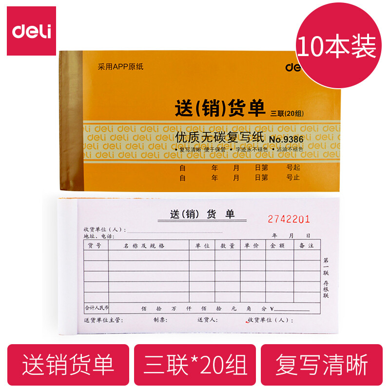 得力(deli) 送货单/销货单/单据/仓库出货单 无碳复写 10本装 9386三联送(销)货单/10本 自营