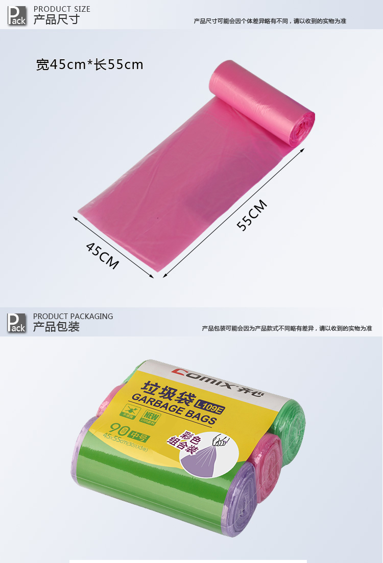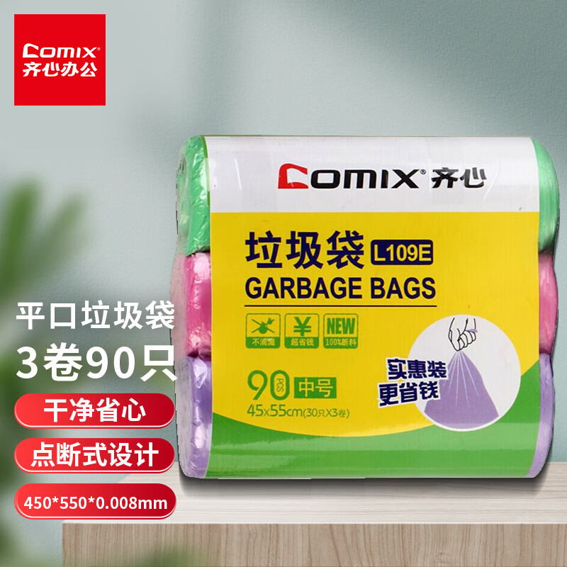 齐心(Comix) 3卷90只 45*55cm中号彩色清洁垃圾袋 办公文具L109E 自营