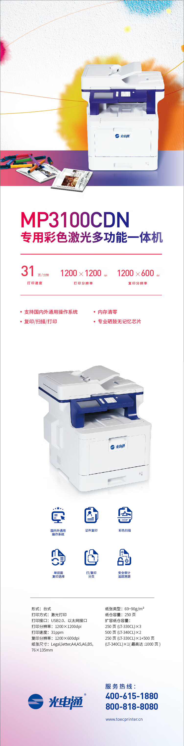 光电通MP3100CDN 全国产化信创设备打印机 专用彩色激光多功能一体机 打印 复印 扫描三合一 自营