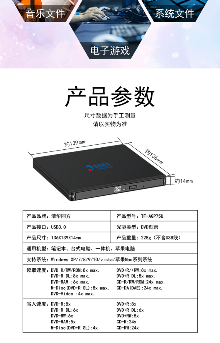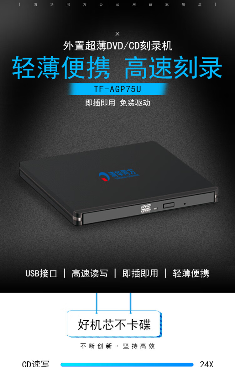 清华同方 外置超薄DVD/CD便携式刻录机 TF-AGP75U USB-C接台式笔记本电脑刻录机 TF-AGP75U 自营