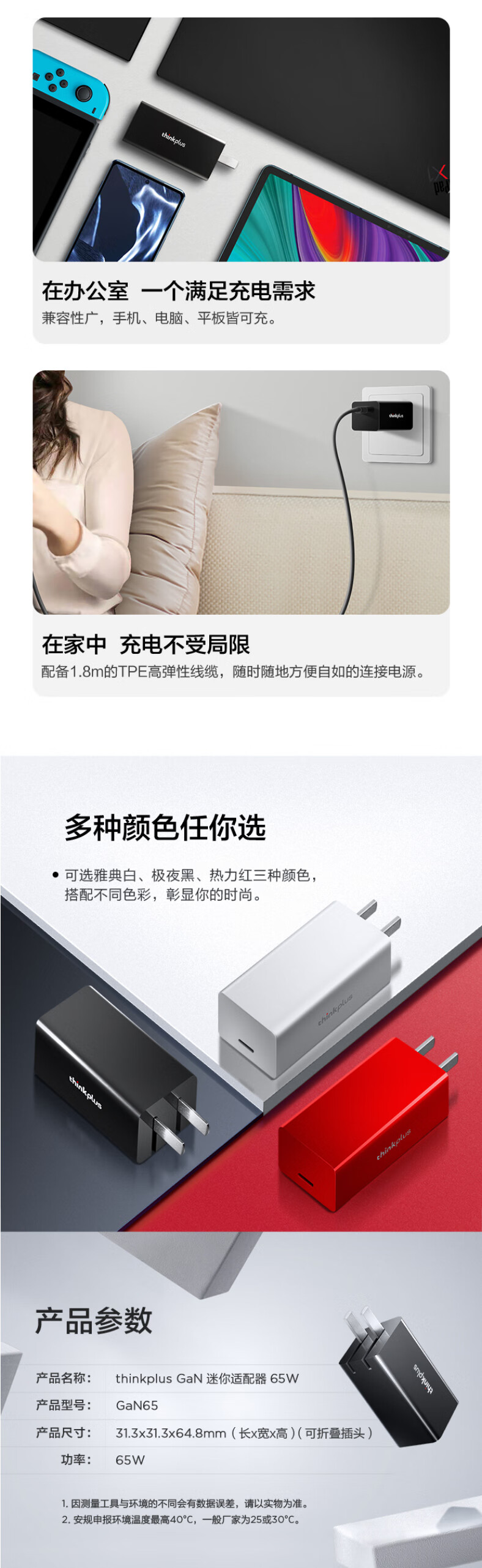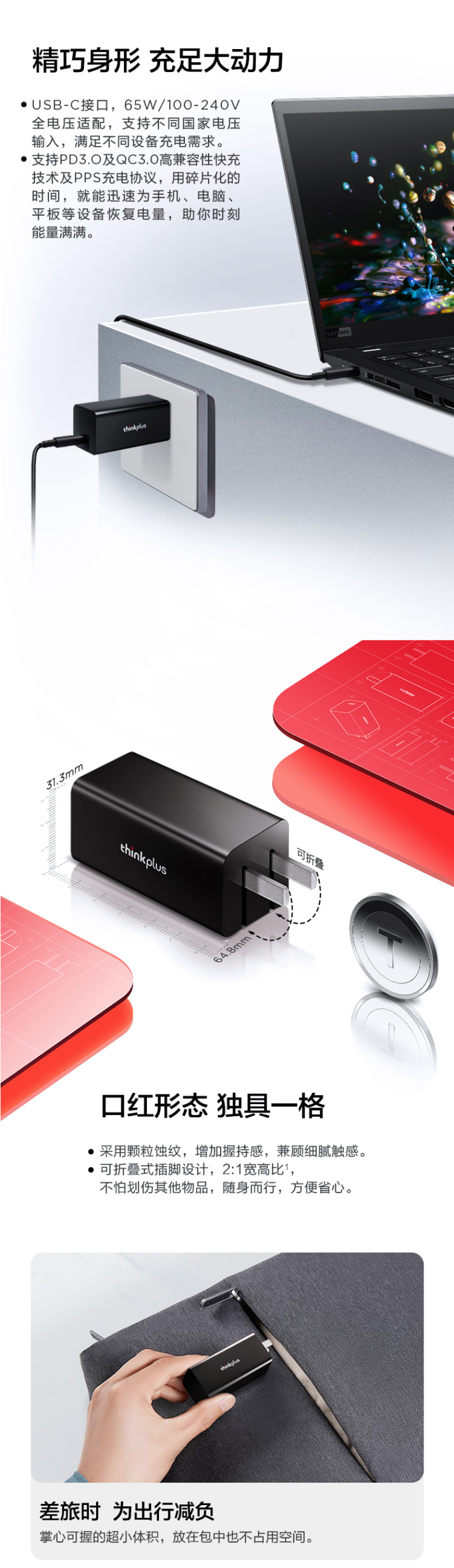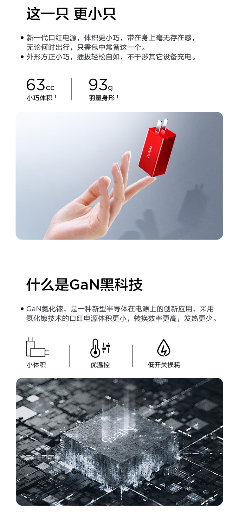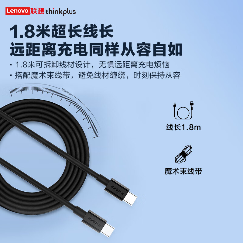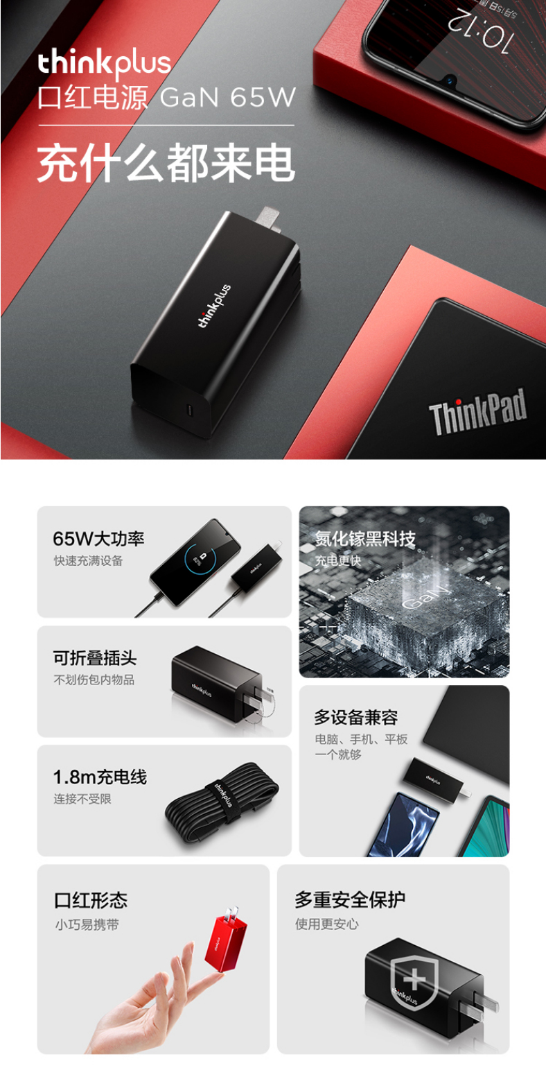 ThinkPlus联想口红电源65W氮化镓充电器Type-C PD快充套装 ThinkPad笔记本适配器 电脑/手机/平板通用4239 自营