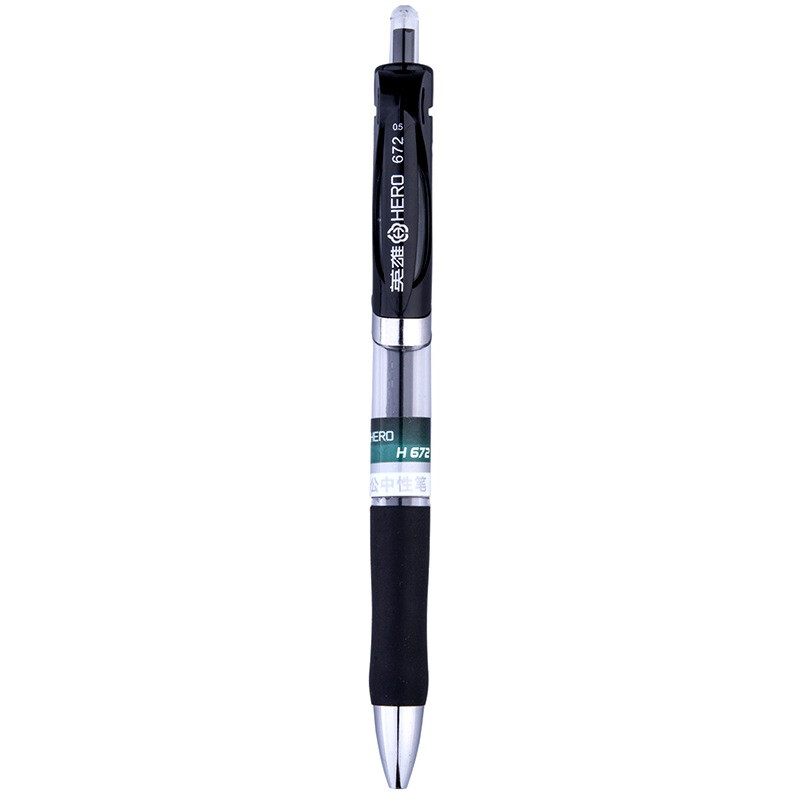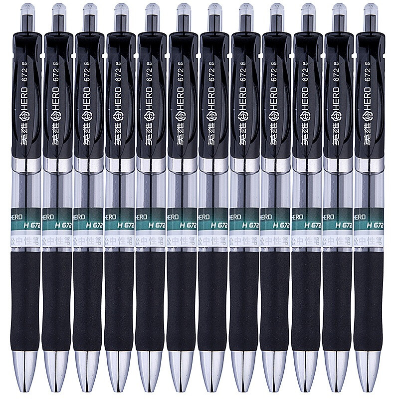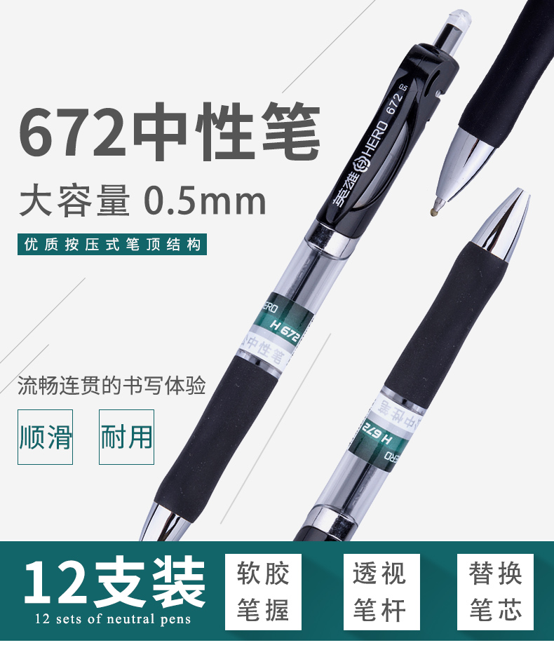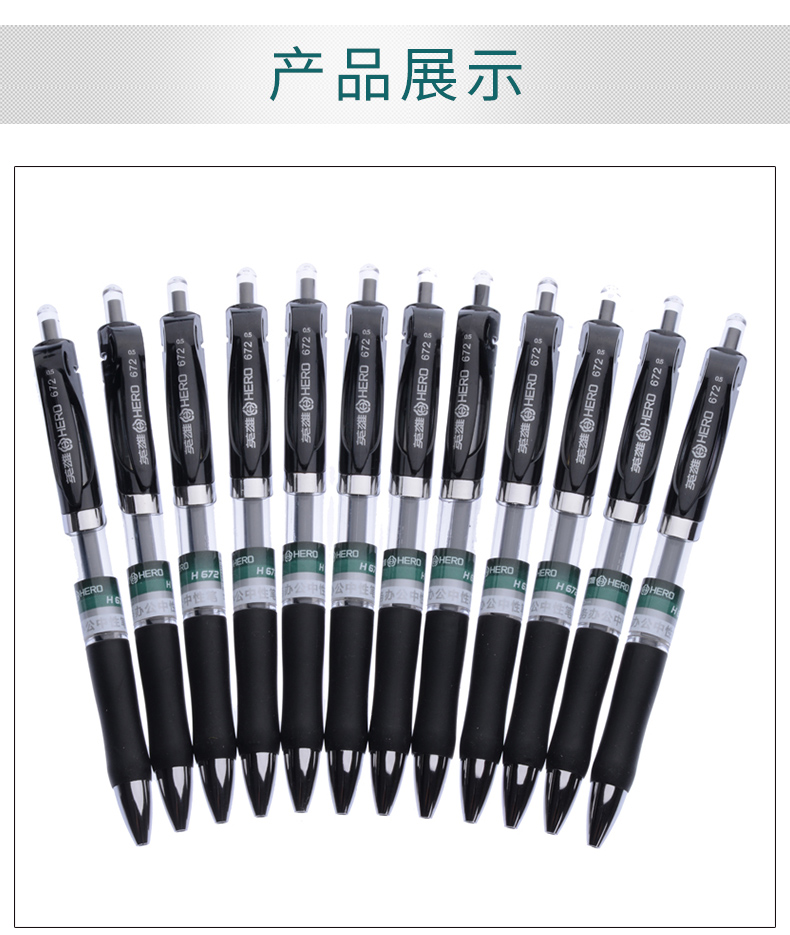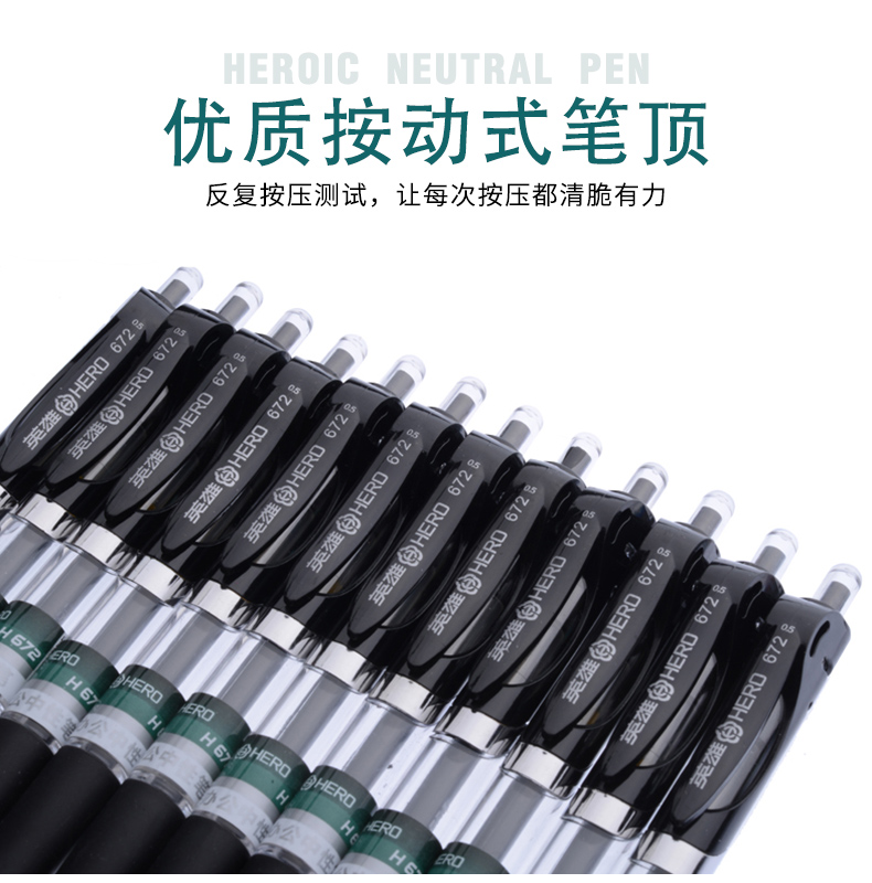 英雄(HERO)中性笔672黑色按动式大容量商务中性笔 签字笔 水笔学生[12支装] 自营