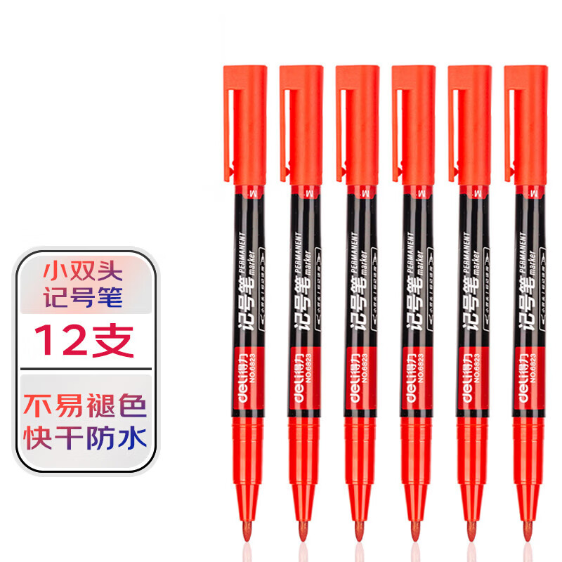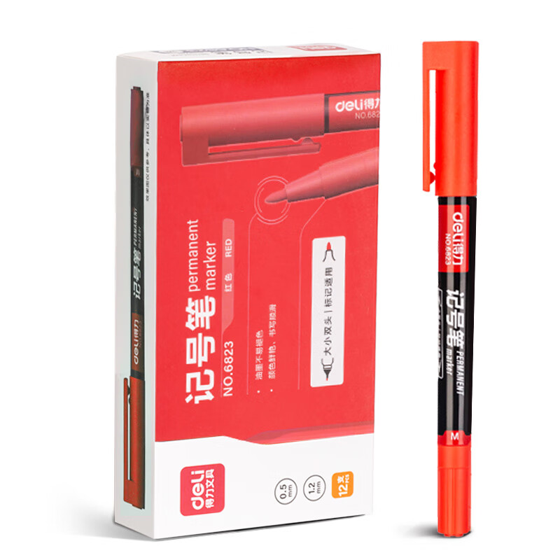 得力(deli) 小双头多用记号笔签字笔 勾线笔会议笔马克笔 双头勾线笔儿童学生 12支/盒 红色 6823 自营