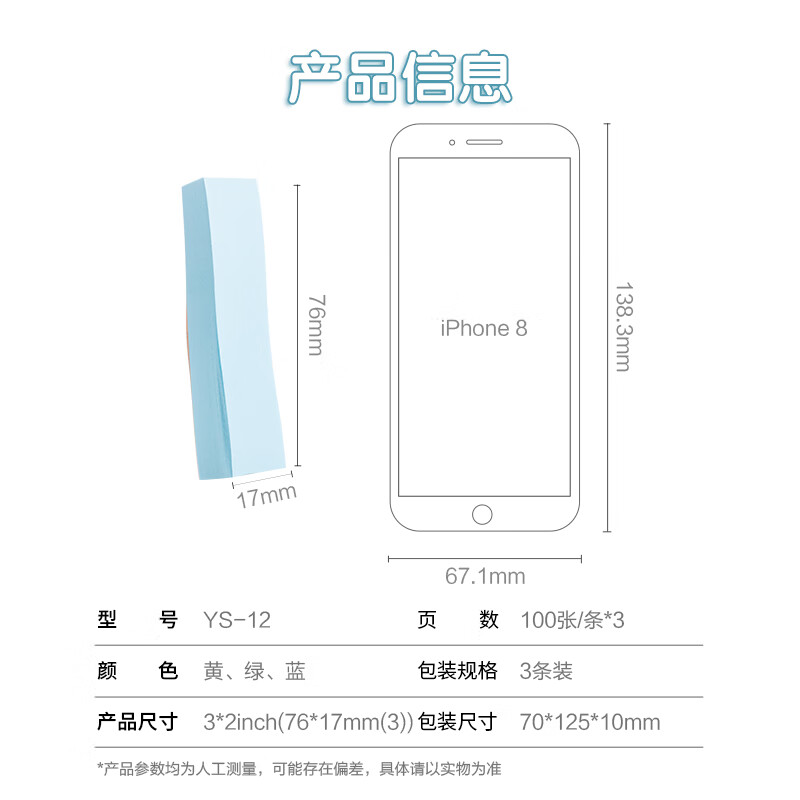 晨光(M&G)文具300张3色便利贴小条 粘性标签贴姓名贴三分条 76*17mm记事留言贴优事贴便签本子 YS-12 自营