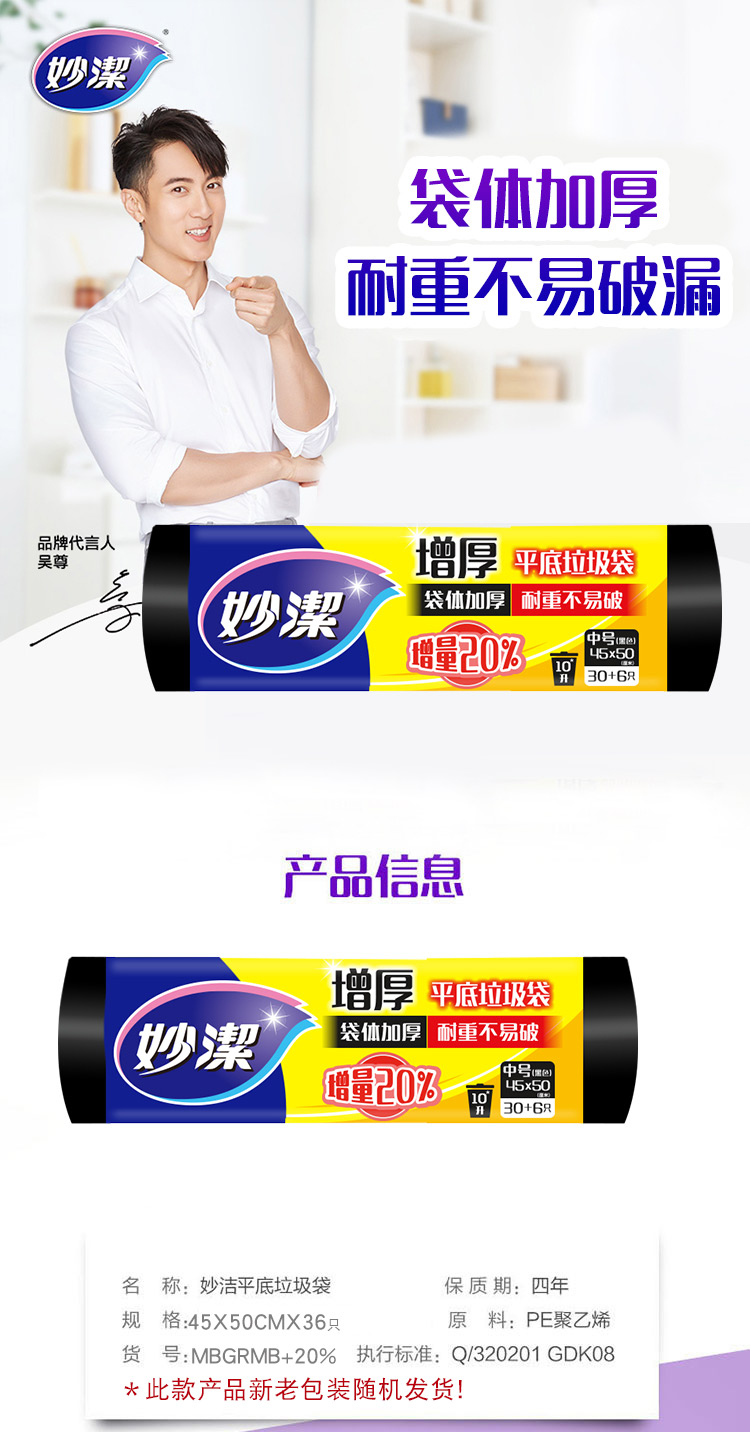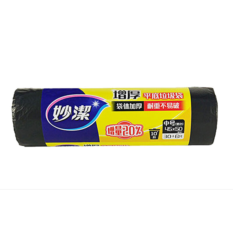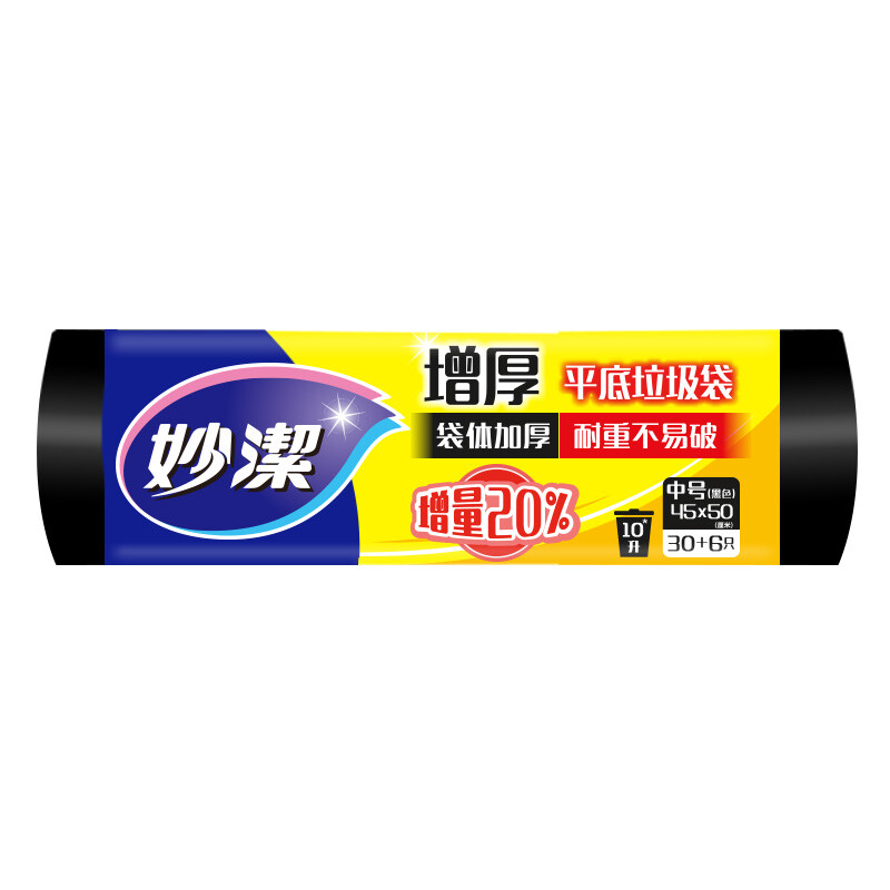 妙洁 增厚平底垃圾袋 中号45*50CM 36只 黑色加厚 耐重不易破 文明干湿分类 自营