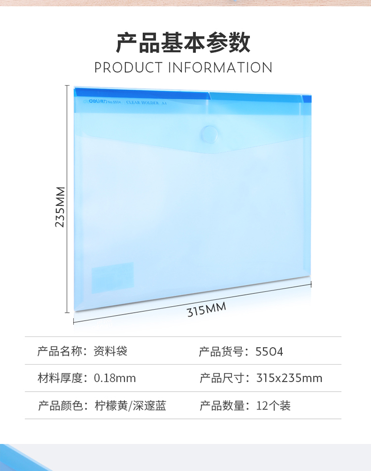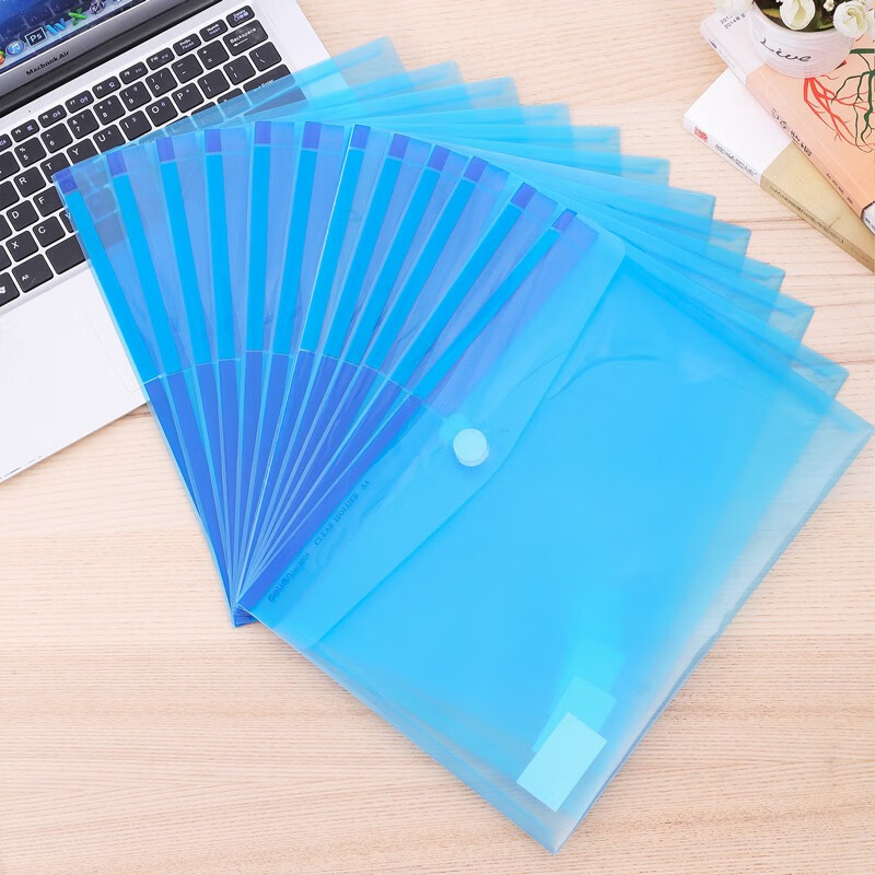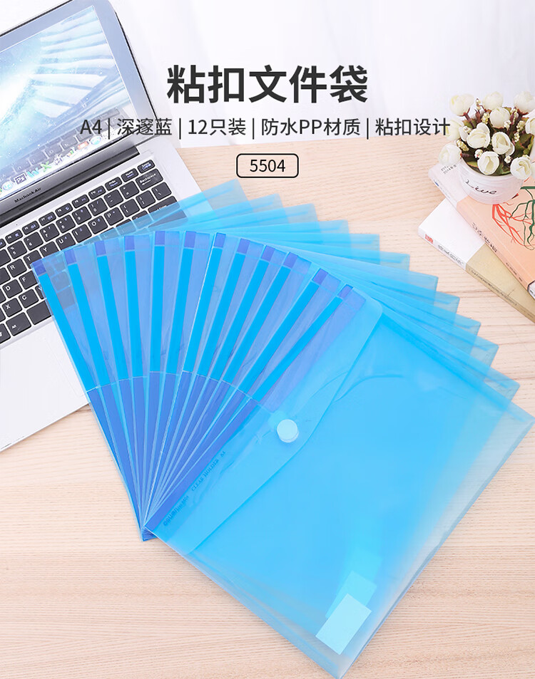 得力(deli)5504 蓝色12只A4加厚透明文件袋 粘扣资料袋 学生试卷收纳袋 防水档案袋 自营