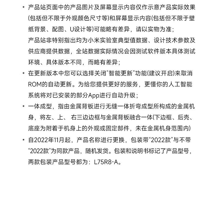 小米电视 Redmi A75 75英寸 4K 超高清电视 金属全面屏电视 游戏智能液晶电视以旧换新L75R8-A 自营