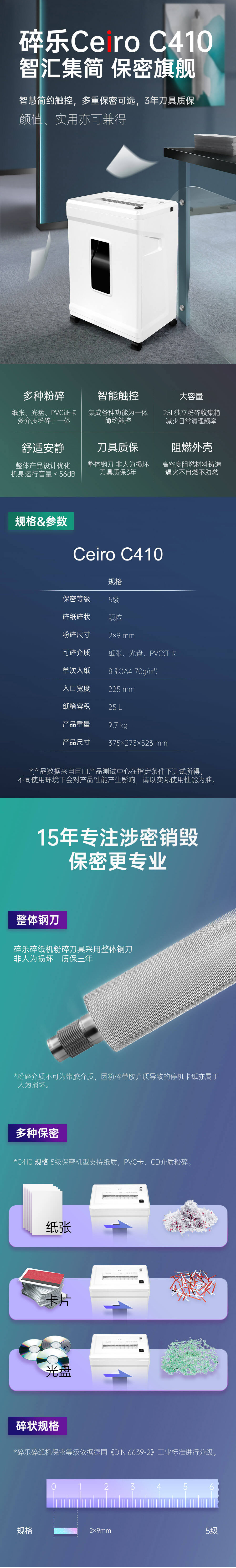 碎乐(Ceiro)C410碎纸机办公家用小型粉碎机级保密独立碎卡碎光盘多功能颗粒粉碎 5级保密 2*9mm 自营
