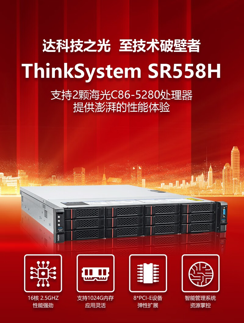 联想服务器(Lenovo)ThinkSystem SR558H 2U机架式服务器主机丨海光处理器 1颗 5280 十六核 2.5G丨双电源 32G内存丨2x2T硬盘丨R930 2G丨四口千兆 自营