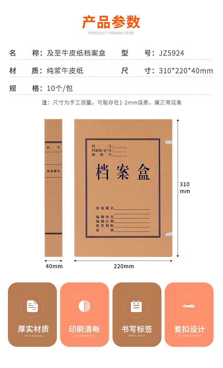 及至 JZ5924 牛皮纸档案盒(700g纯浆)310*220*40mm(10个/包) 自营