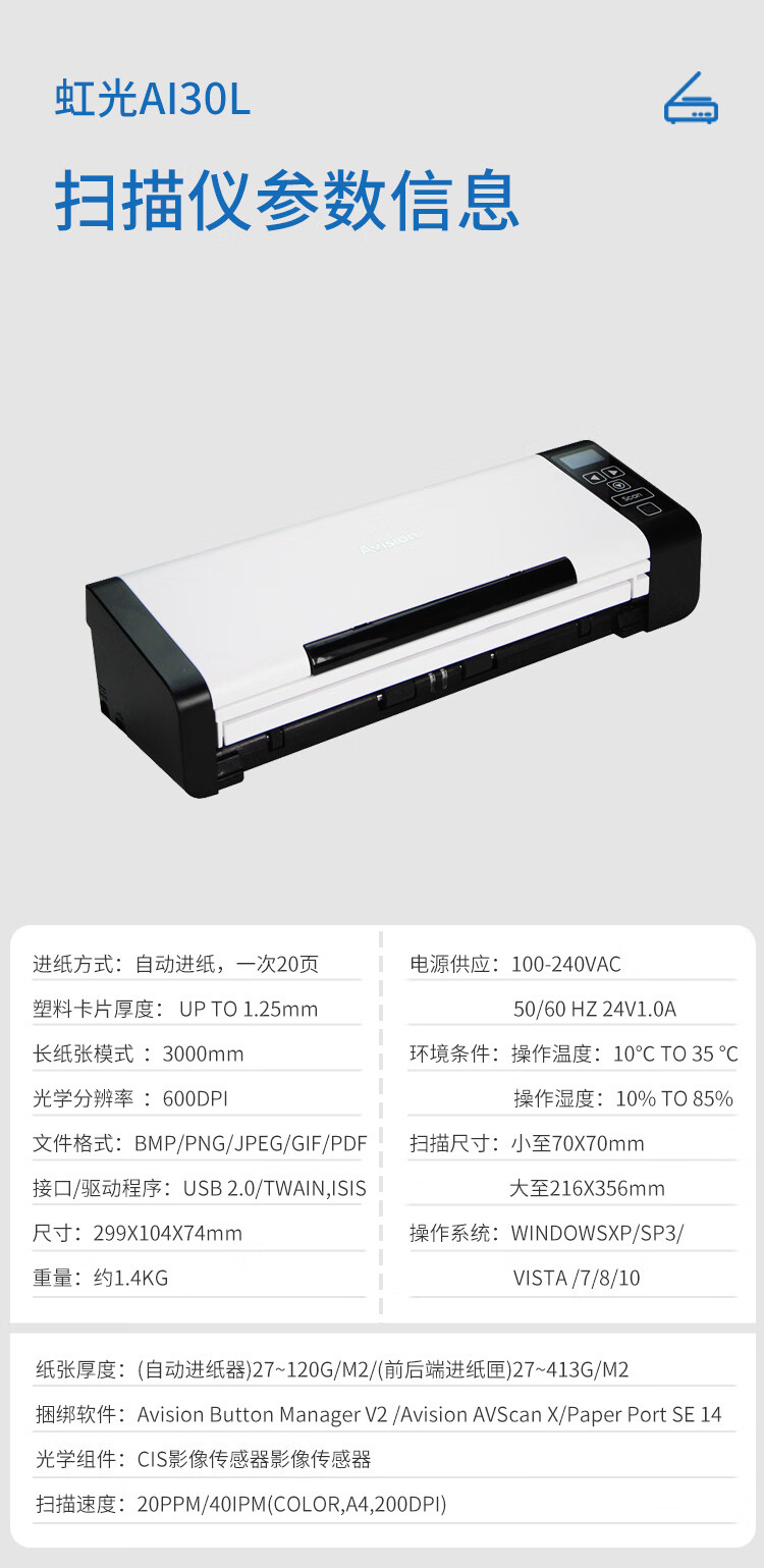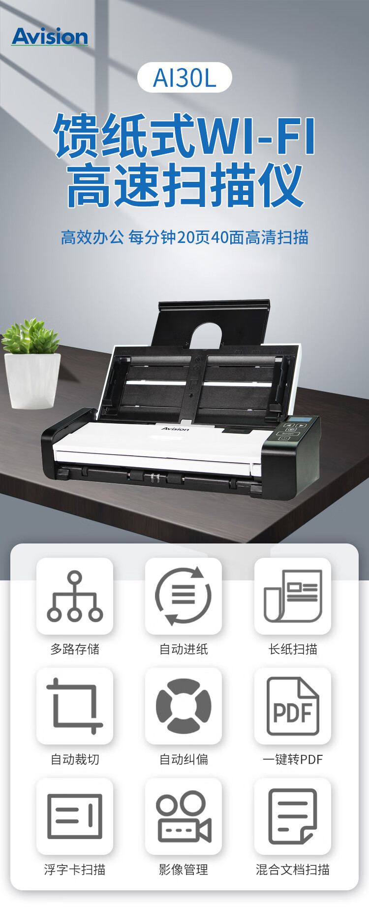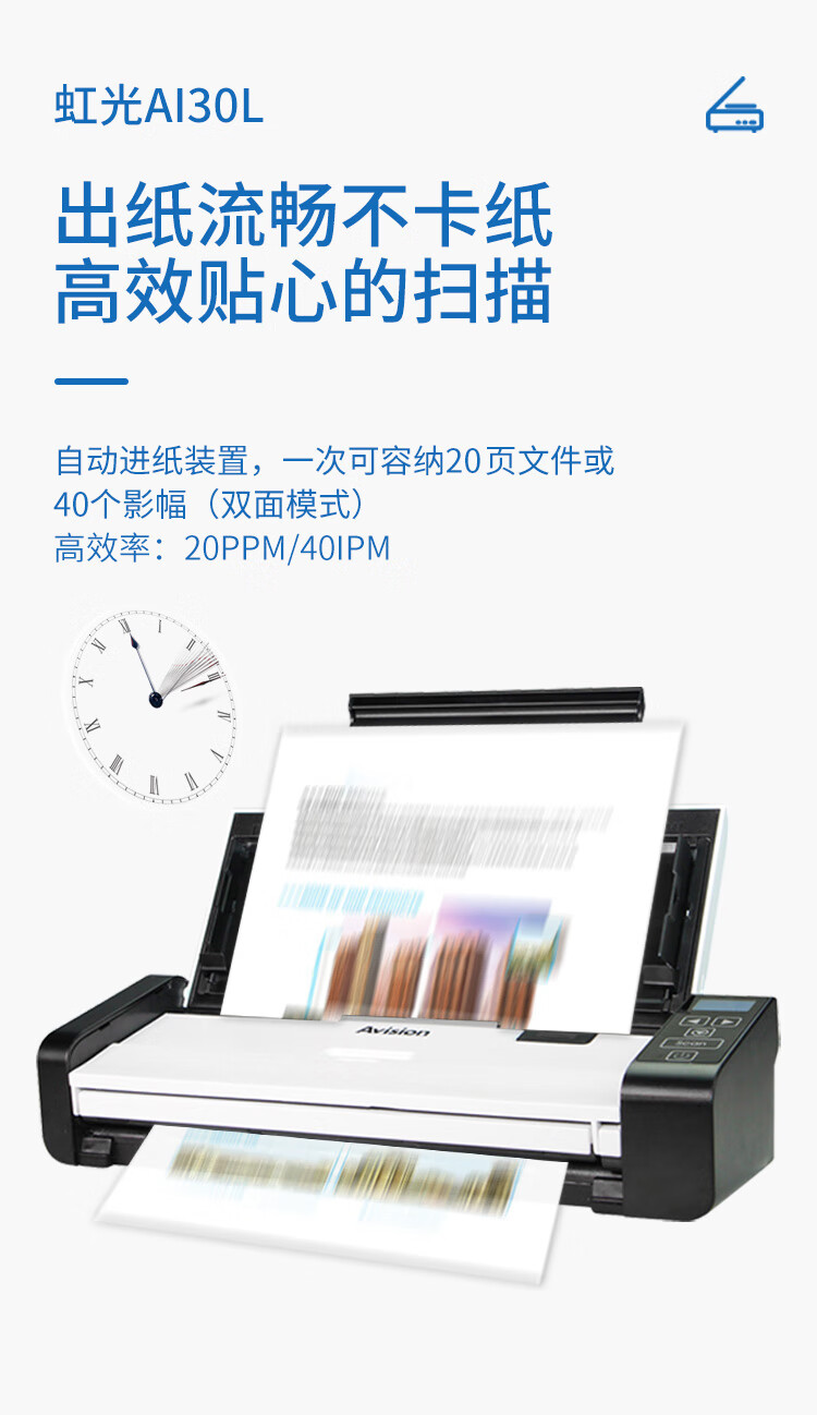 虹光(Avision)馈纸式扫描仪A4双面文件连续自动高速扫描AI30L 可扫描办公文档卡片等 支持国产系统 自营