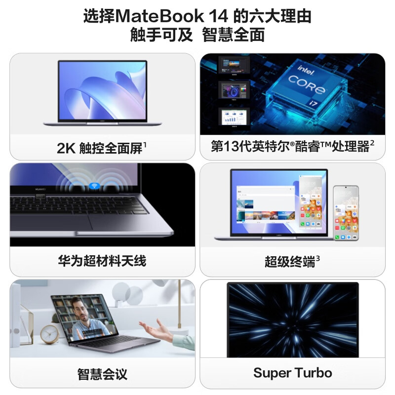 华为笔记本电脑MateBook 14 2023 13代酷睿版 i5 16G 512G 14英寸轻薄办公本/2K触控全面屏/手机互联 皓月银 自营