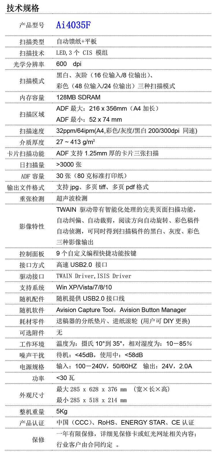 虹光(Avision)馈纸式/平台式双平台扫描仪A4彩色双面文件连续自动高速扫描 Ai4035F 支持国产系统 自营