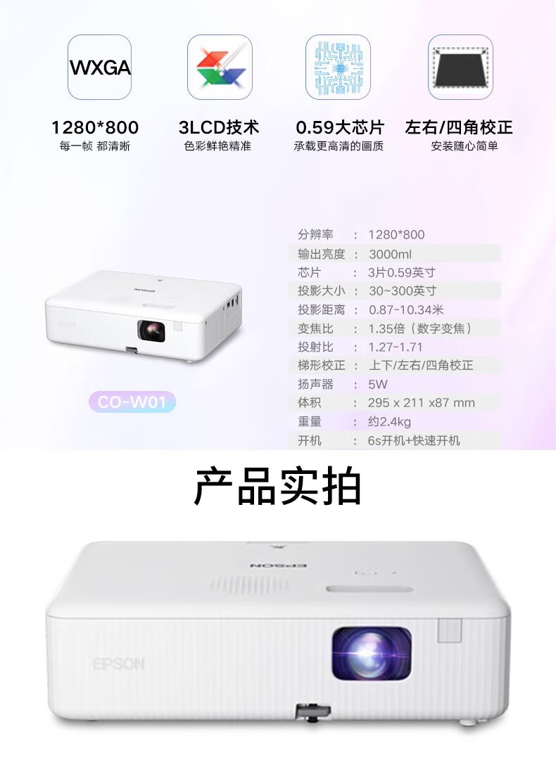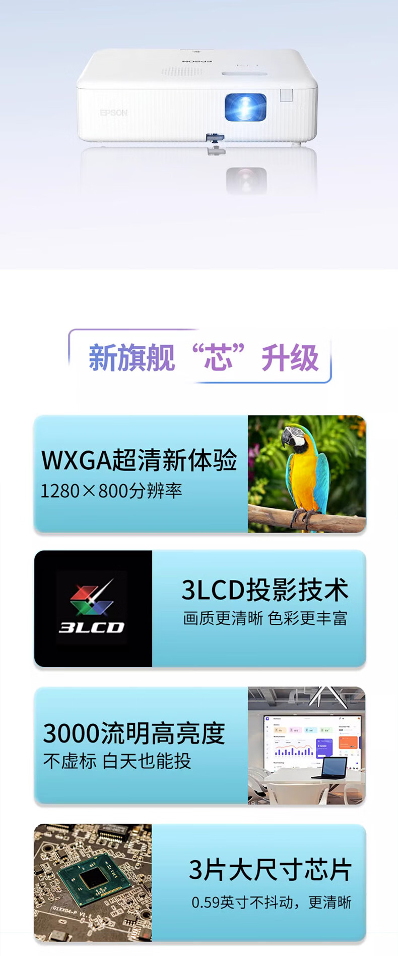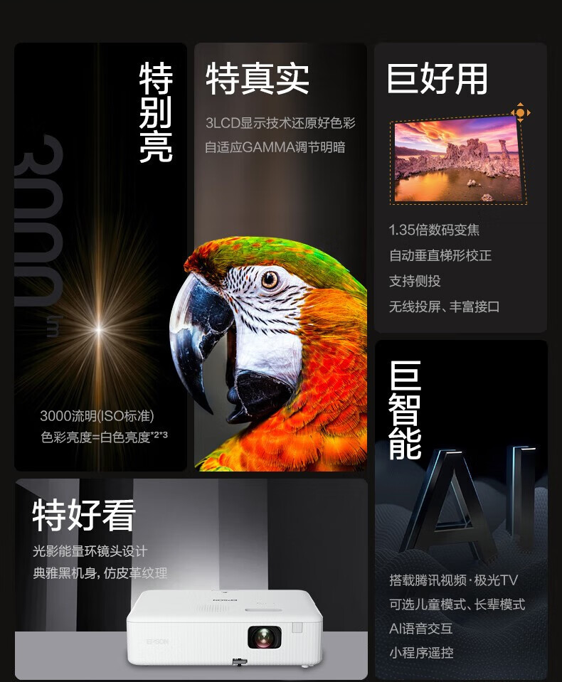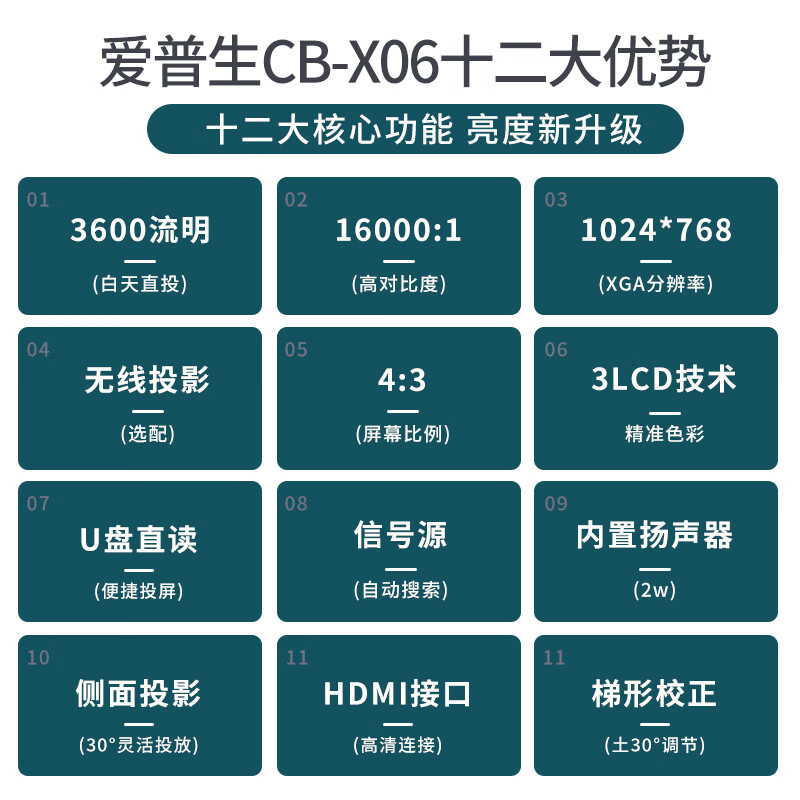 爱普生(EPSON)投影仪家用家庭影院 办公教学网课会议商务培训无线投屏WiFi白天直投投影机 CB-X06E【3600流明 16000:1】 官方标配升级无线魔盒 自营