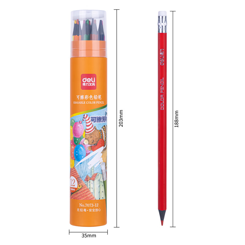 得力(deli)12色六角杆皮头可擦彩铅(混)筒装美术绘画儿童礼物涂鸦手绘易洗可擦7073-12非自动活动铅笔 自营