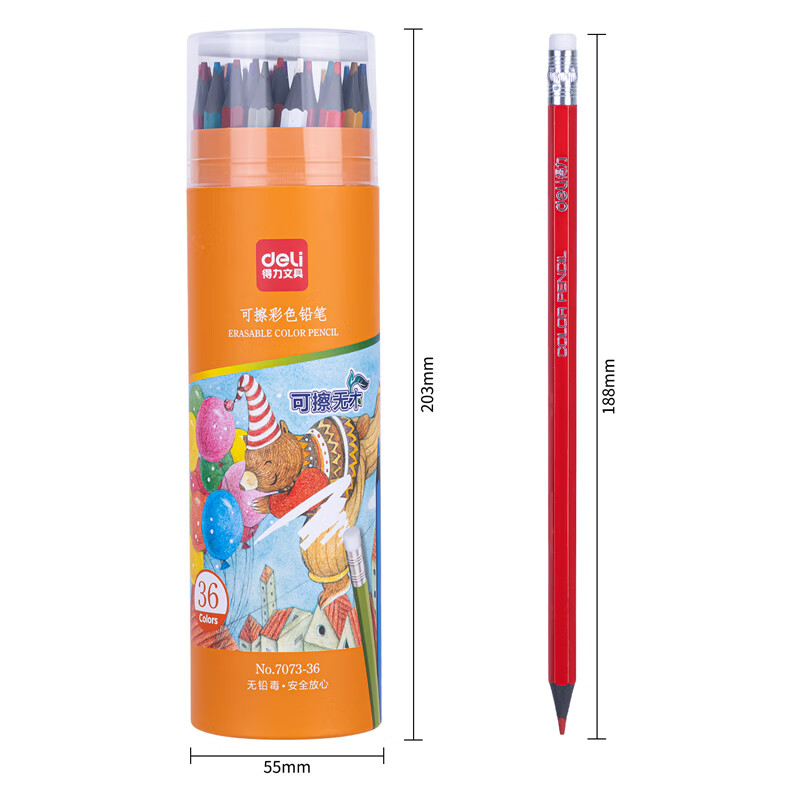得力(deli)36色六角杆皮头可擦彩铅(混)(36色/筒)学生绘画涂色画笔画具画材美术套装 开学季暑假礼物7073-36 自营