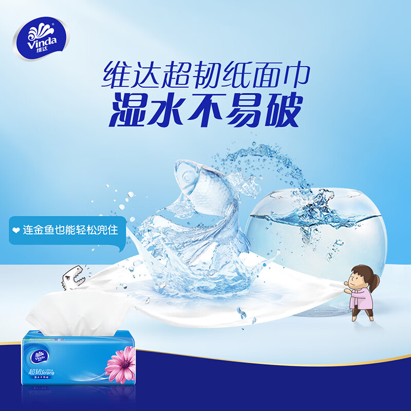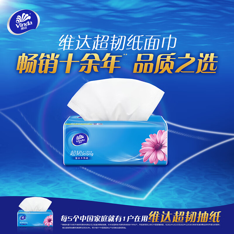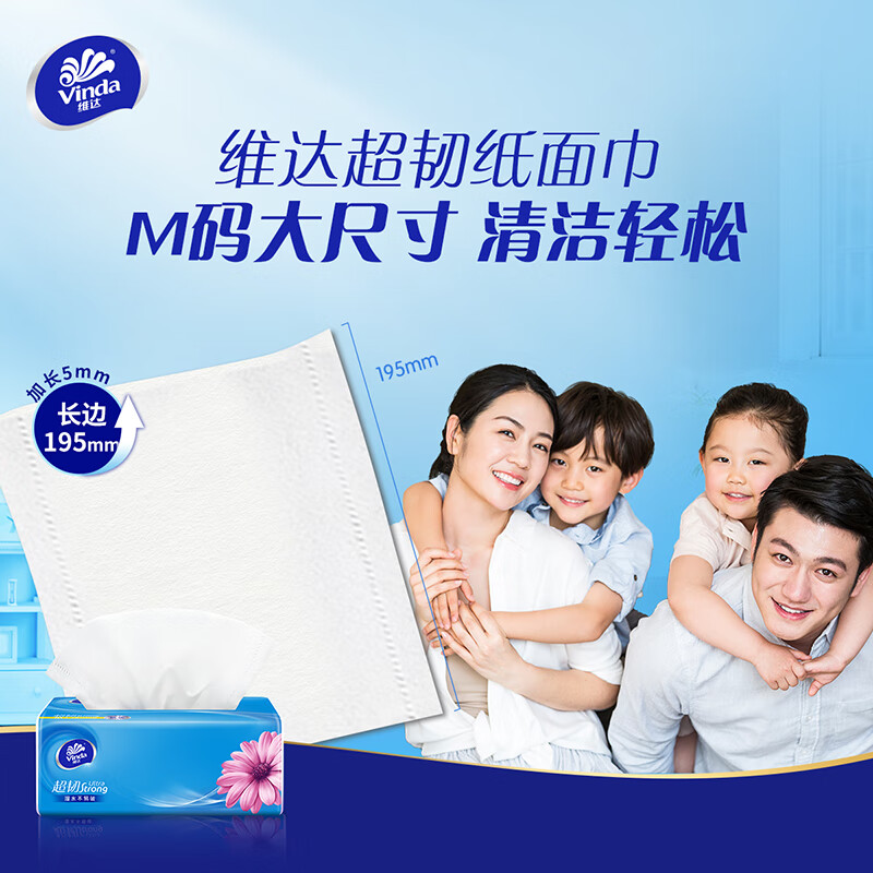 维达(Vinda)抽纸 超韧3层120抽*8包M码 湿水不易破 卫生纸 纸巾 餐巾纸 自营