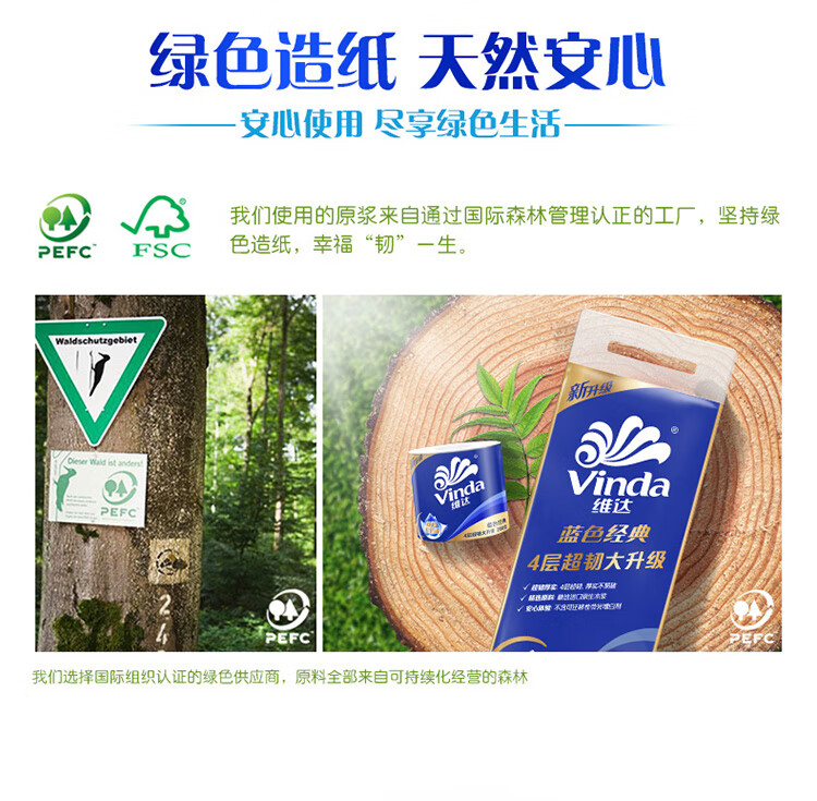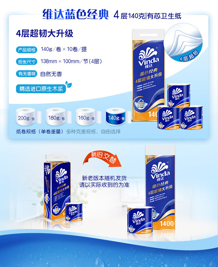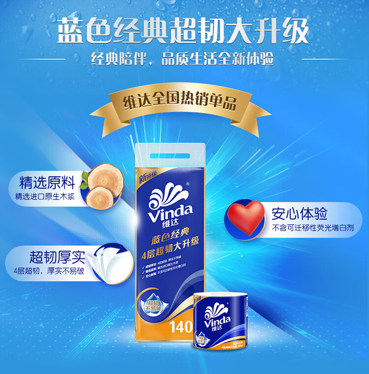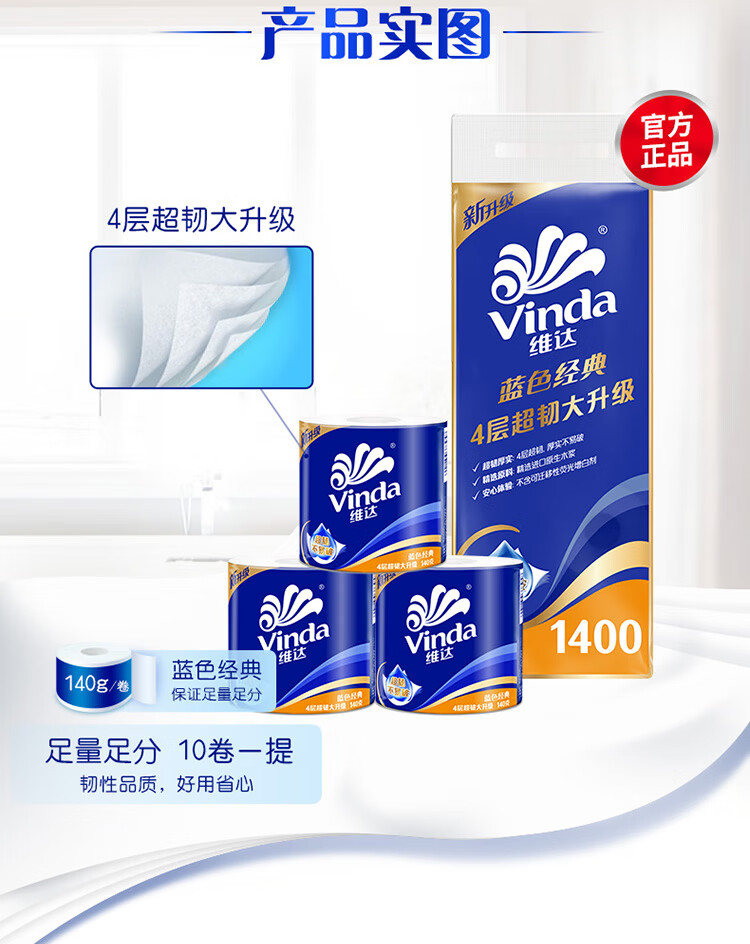 维达(Vinda)卷纸 蓝色经典140克10卷 4层加厚 卫生纸卷筒纸 纸巾卷纸 自营