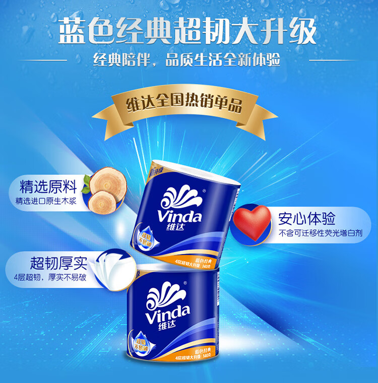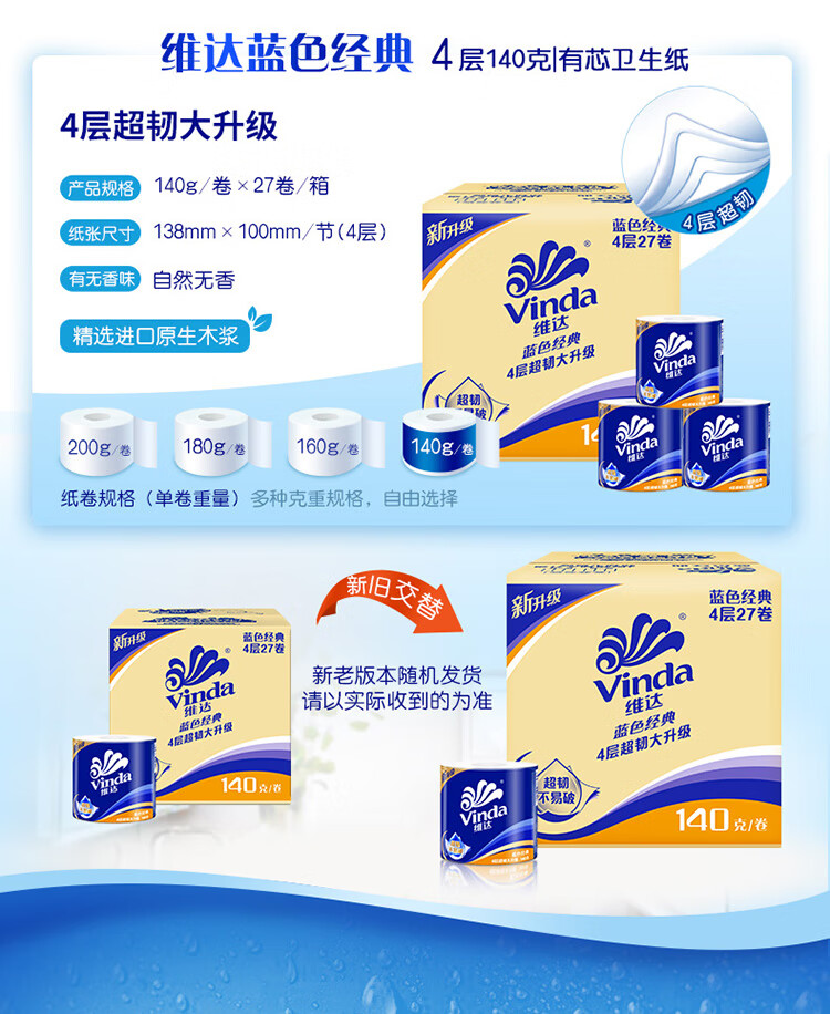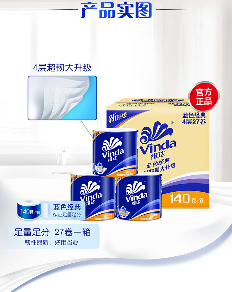 维达(Vinda)卷纸 蓝色经典140克27卷 4层加厚 纸巾 整箱 自营