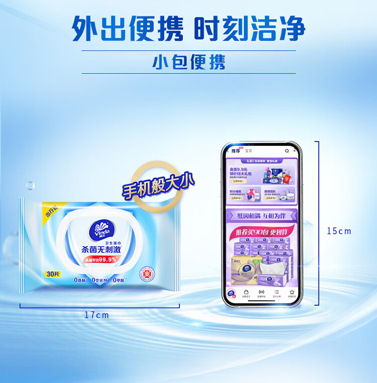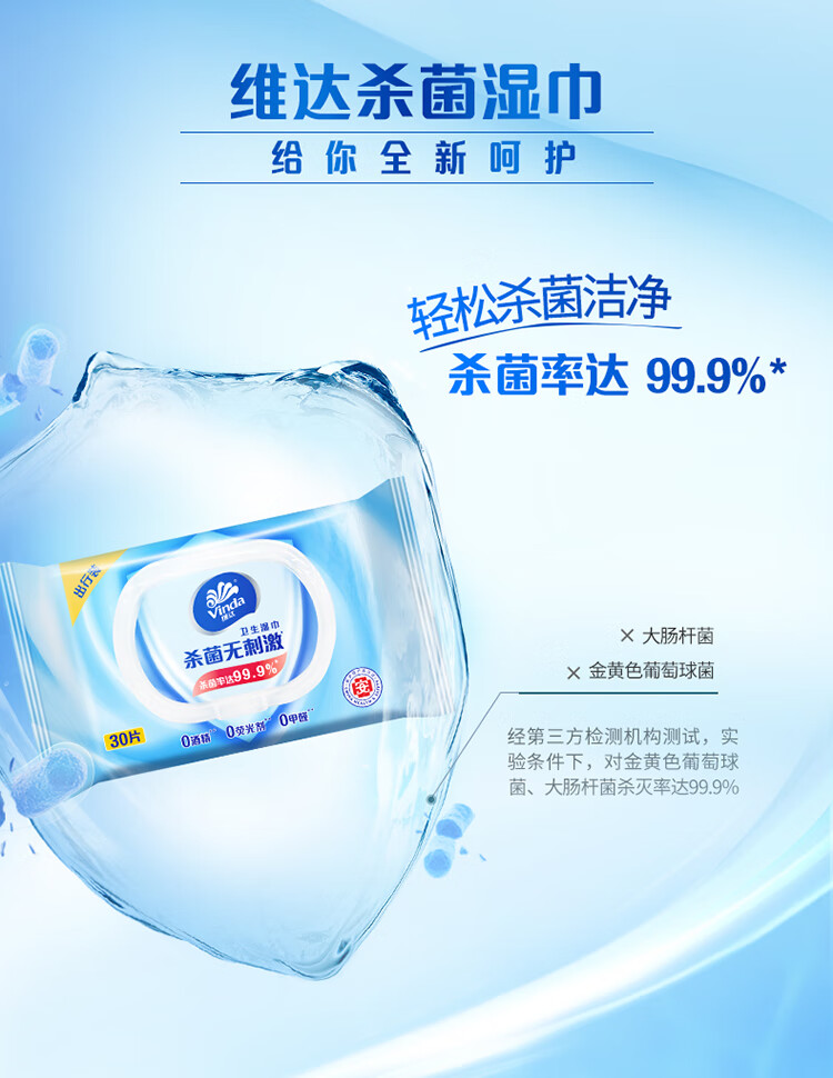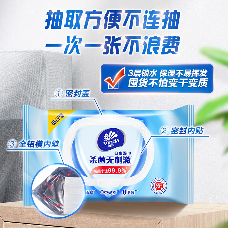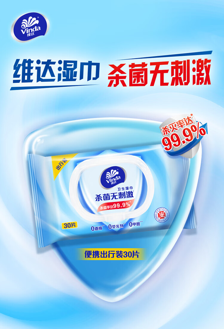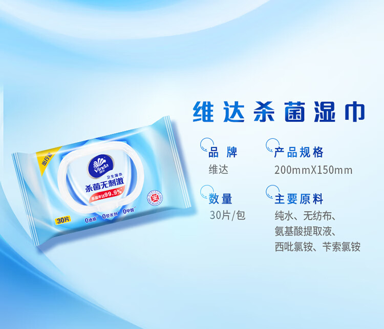 维达(Vinda)湿巾湿纸巾家庭便携装30片 清洁无刺激卫生湿巾 细菌杀灭率99.9% 自营