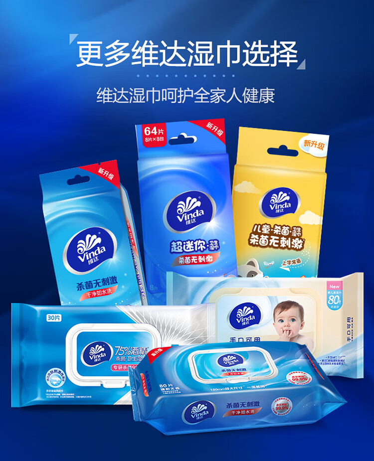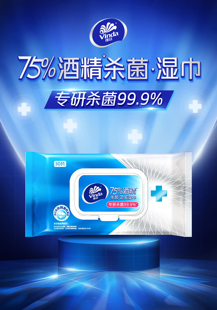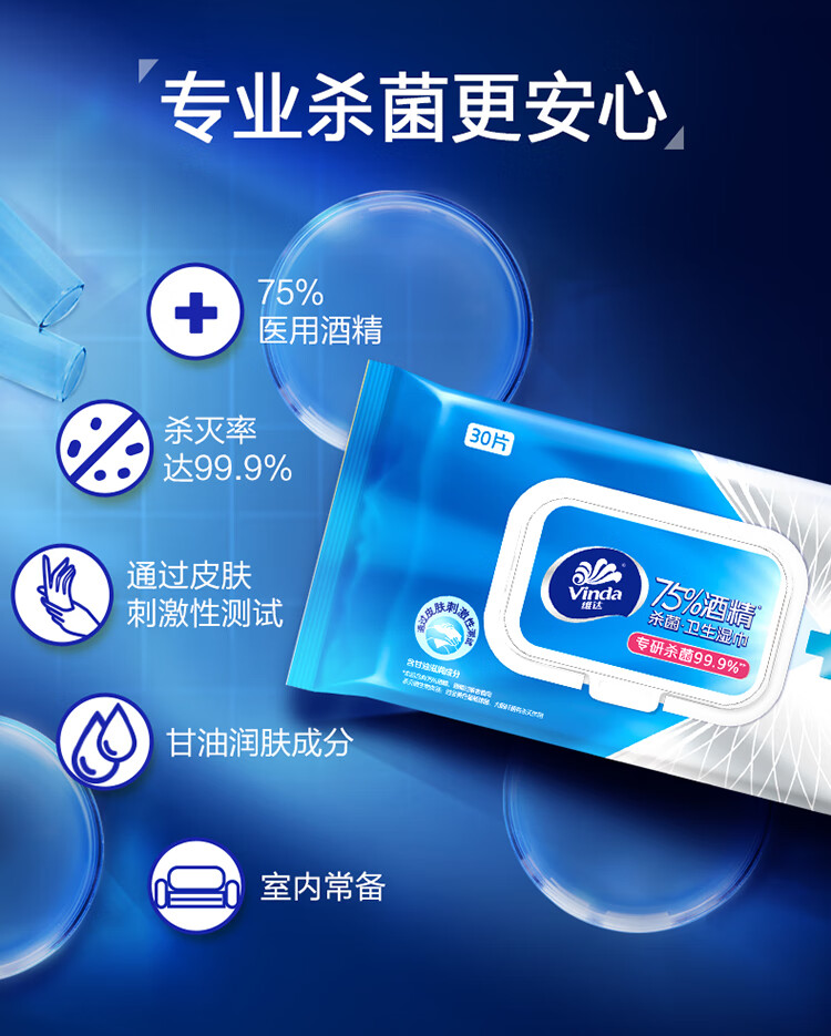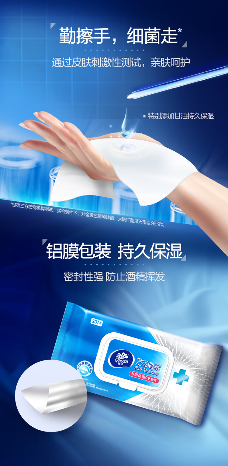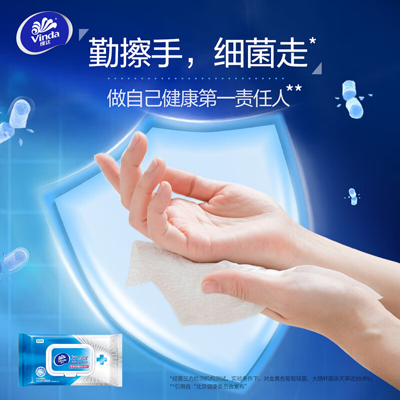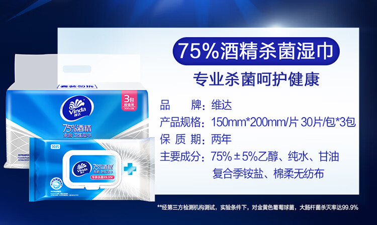 维达(Vinda)湿巾 75%酒精湿巾30片*3包专业杀菌湿纸巾 酒精棉片湿巾纸 自营