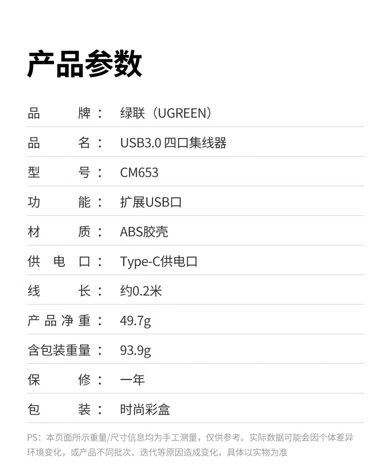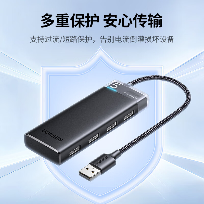 绿联 USB3.0分线器扩展坞 4口HUB集线器拓展坞 笔记本电脑转换器转接头延长线 带Type-c供电 0.2米 15548 自营