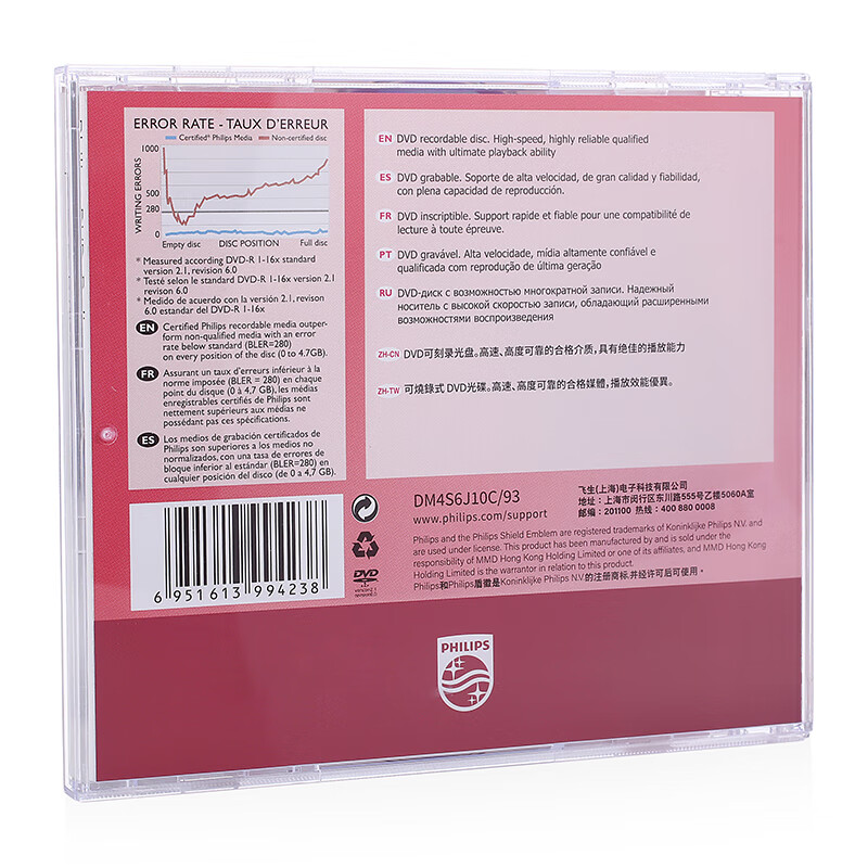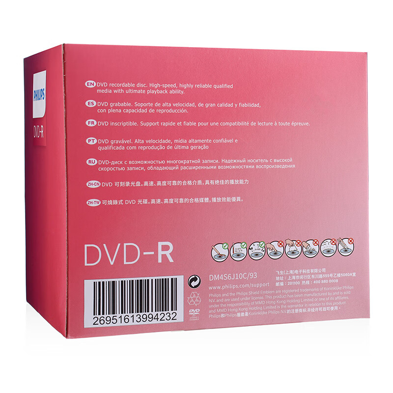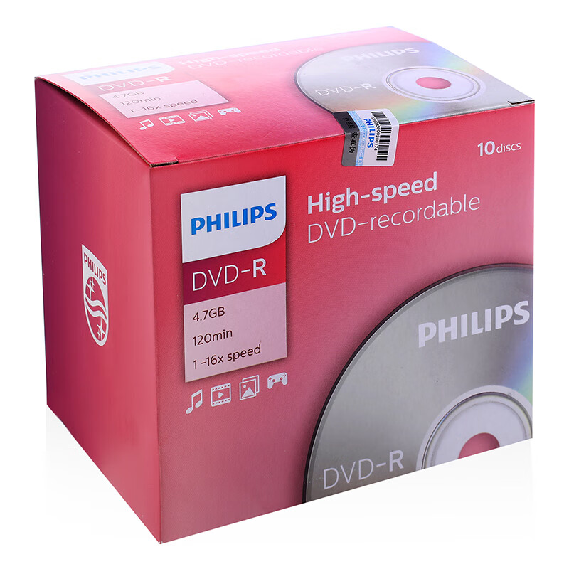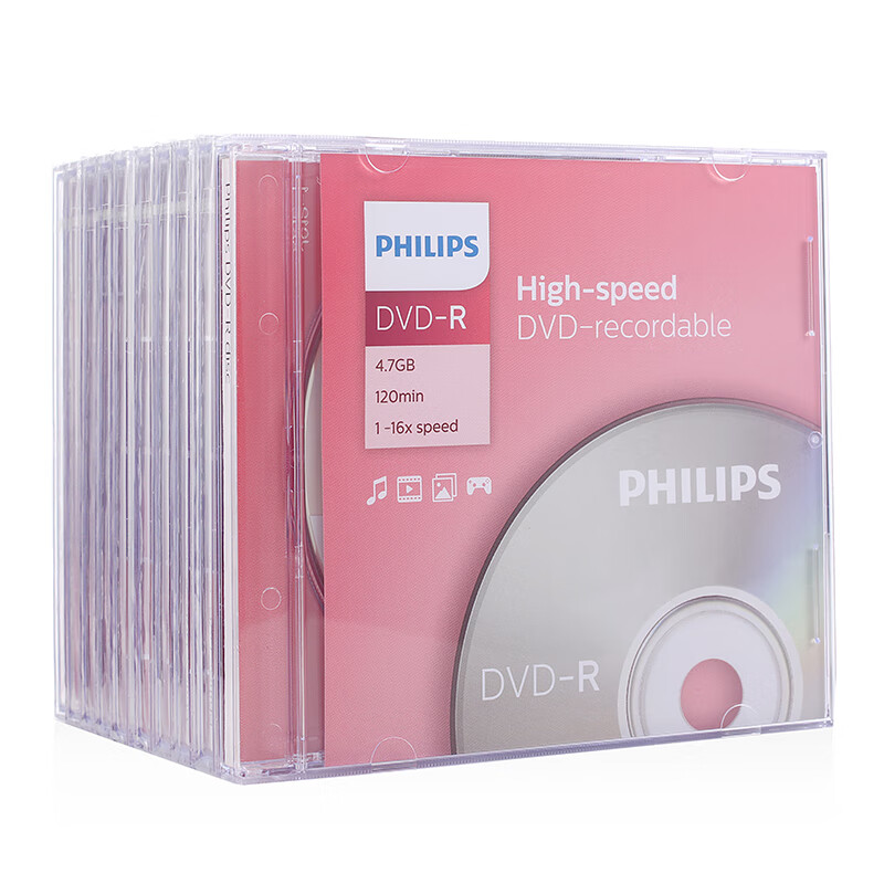 飞利浦(PHILIPS)DVD-R 光盘/刻录盘 单片盒装10片/包 16速4.7G 空白光碟 自营