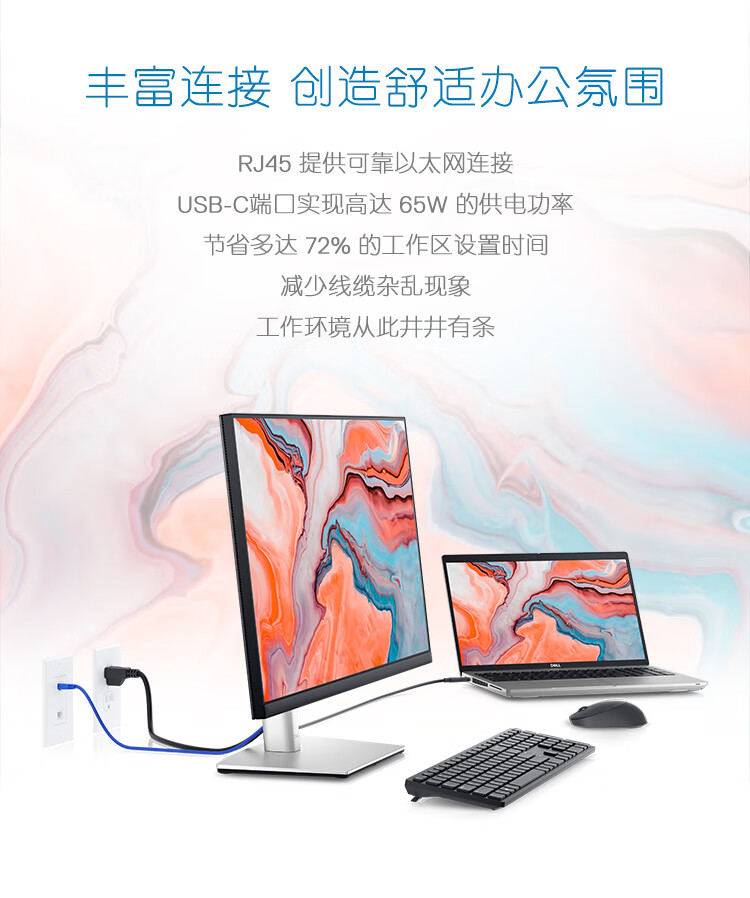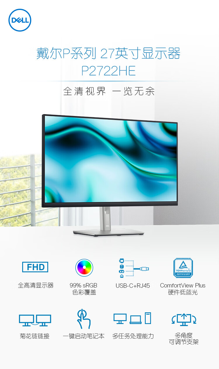 戴尔(DELL)27英寸 办公显示器 FHD IPS 防蓝光 Type-C 65W反向充电 旋转升降支架 电脑显示屏 P2722HE 自营