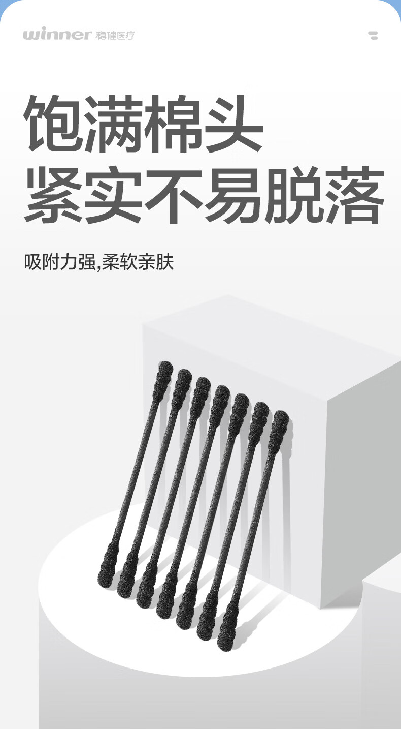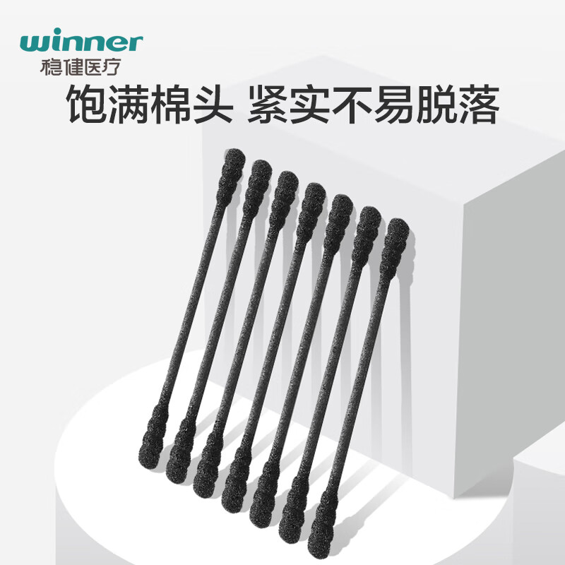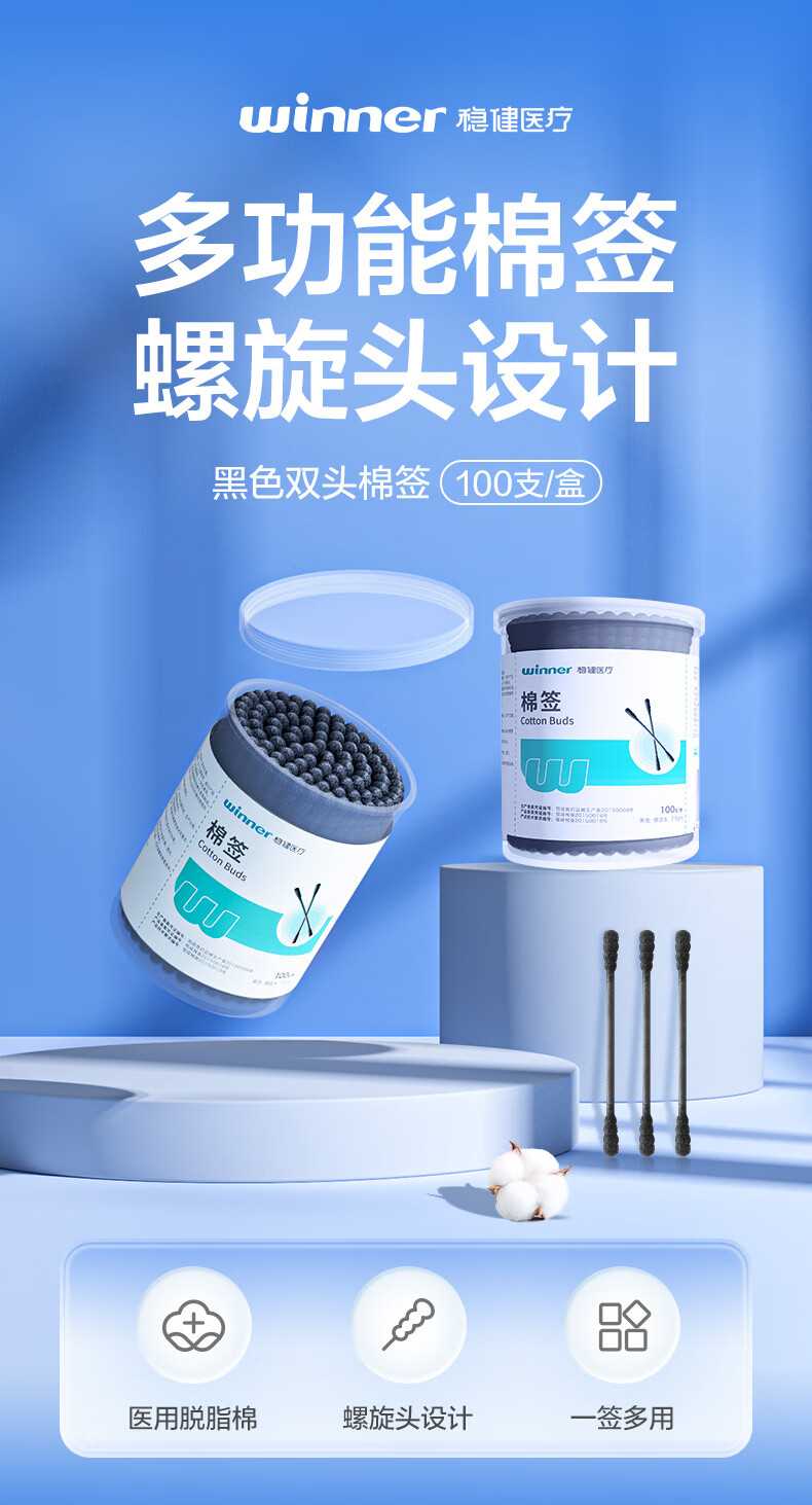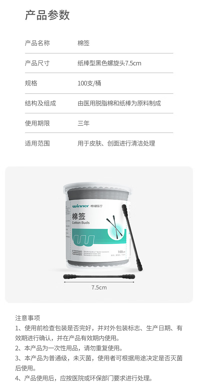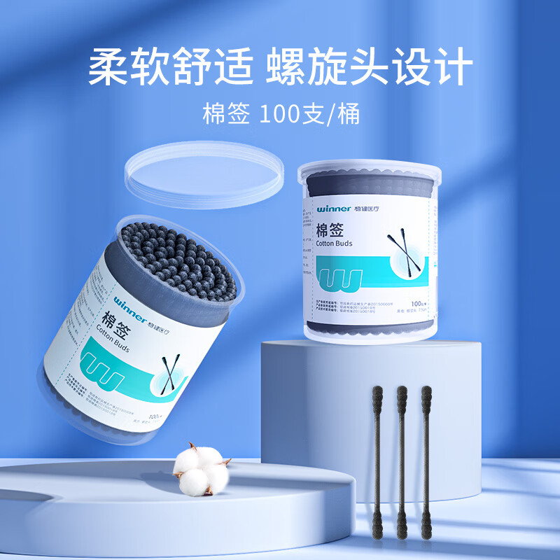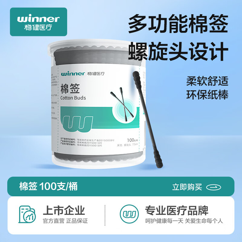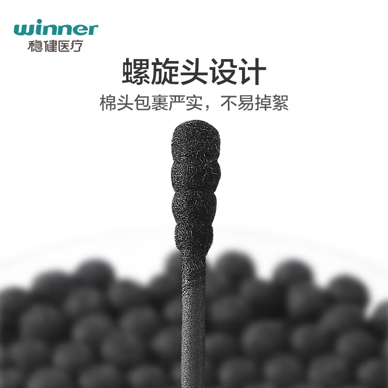 稳健(Winner) 一次性医用棉签7.5cm 100支/桶 黑色双螺旋头棉棒成人儿童日常清洁护理化妆掏耳棉棒 自营